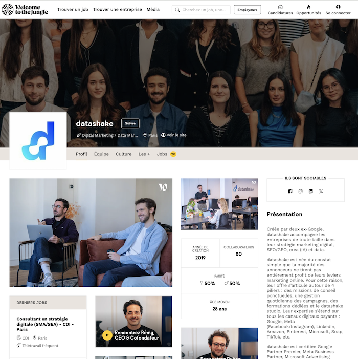 datashake figure parmi les 30 entreprises les plus visibles sur Welcome to the Jungle, particulièrement auprès des profils juniors. Avec 850 000 impressions de recherche (x10 par rapport aux entreprises de même taille et secteur), l'entreprise a su se démarquer grâce à son approche organique.