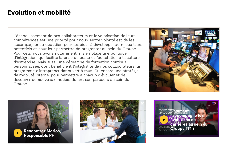 TF1 rassemble un corps de 150 métiers, ce qui démultiplie les opportunités de carrière au sein du groupe. En 2022, c’est 130 collaborateurs qui ont pu bénéficier d’une mobilité interne, dont le quart a complètement changé de métier. Parmi nos différentes initiatives portées en interne, un parcours de formation personnalisé avec un coach carrière accompagne les talents sur la réflexion concernant leur parcours et les différentes opportunités disponibles au sein du groupe TF1 et du groupe Bouygues.